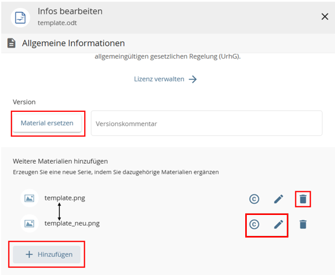 Ist die OEROpen Educational Resources (OER), auf Deutsch offene Bildung More ein Serienobjekt, und es sollen Unterobjekte ersetzt werden, müssen bei Weitere Materialien hinzufügen die entsprechenden Dateien gelöscht und die neuen hinzugefügt werden. Durch Drag und Drop können die Dateien dann wieder in die gewünschte Reihenfolge gezogen werden. Weiterhin achten Sie bitte darauf, in den neuen Unterobjekten die Metadaten zu ergänzen bzw. zu ändern insofern sie sich von denen des Hauptobjekts unterscheiden.